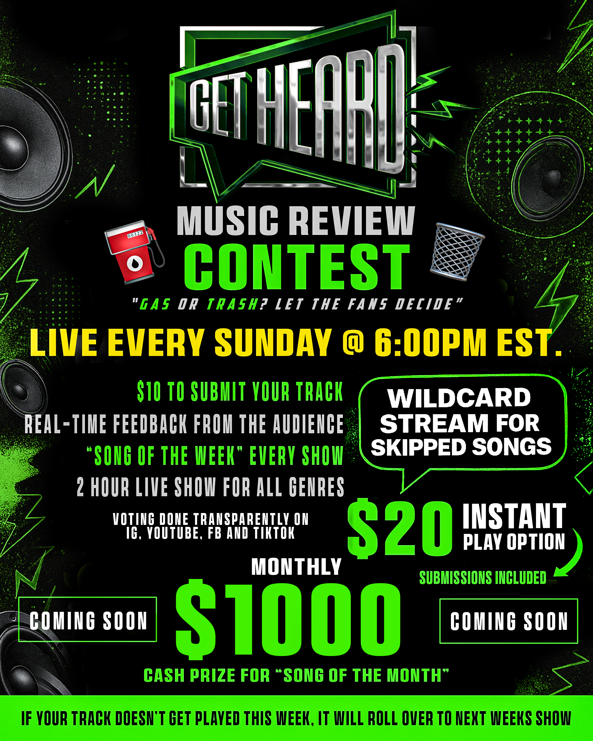 Do you believe your music is next up? Put your song to the test with Get Heard — the rawest, most interactive music review show where the people decide. Every week, artists submit their tracks, and the live chat gives the verdict: Gas or Trash. And every month, one artist will walk away with a $1000 cash prize for having the Song of the Month!